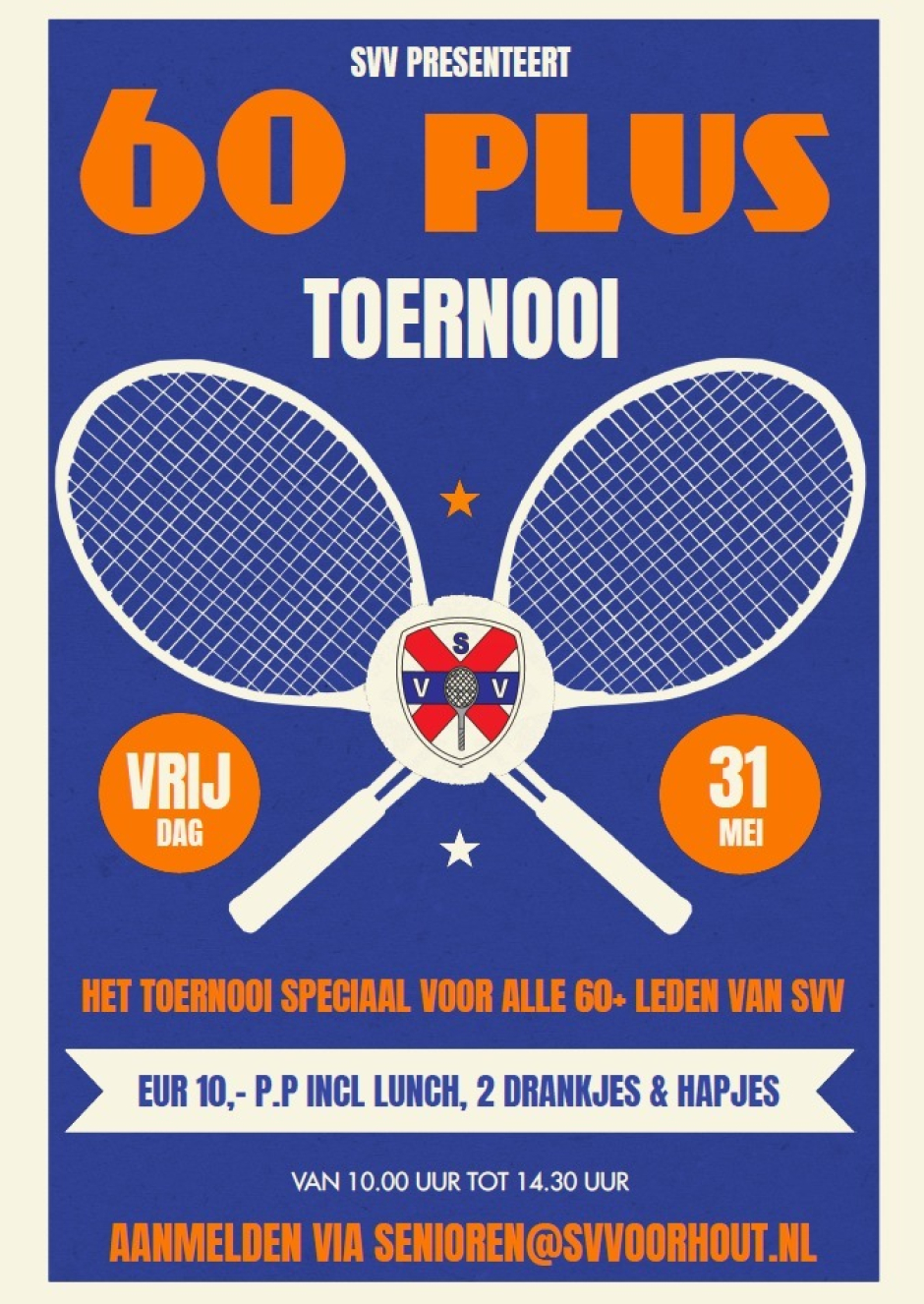 Meld je nu aan voor het 60+ toernooi! Op vrijdag 31 mei organiseert SVV voor het 3e jaar op rij weer het gezellige 60+ tennistoernooi. Het toernooi speciaal voor alle leden die de leeftijd van 60 gepasseerd zijn. Wegens succes herhaald want vorig jaar was het toernooi zo gezellig en zonnig dat we het dit jaar natuurlijk weer moeten organiseren. We gaan dit jaar alle deelnemers indelen op speelsterkte dus leuke wedstrijden worden het sowieso. En mannen van SVV, doe ook gewoon mee!
