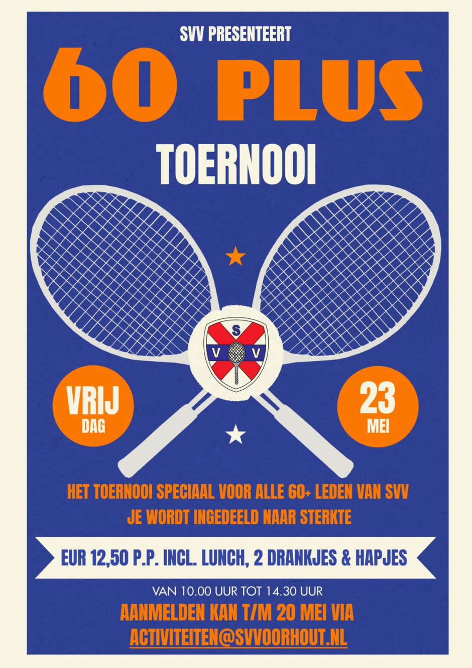 Only4Men – Stoere mannen, bier und wurst – vrijdag 4 juli Voor alle stoere mannen van SVV organiseren wij eerder dan normaal, namelijk vrijdag 4 juli, het Only4Men toernooi. We gaan dan letterlijk het jaar doorzagen. Het beloofd een stoere mannenavond te worden met veel spectaculaire activiteiten. Gezien het tijdstip van het jaar hopen we op een lange zwoele avond met het thema "stoere mannen, bier und wurst". De avond start om 19.30 uur en voor EUR 25 p.p. ben je de hele avond voorzien van hapjes en drinken. Het buffet zal stoer en Duits zijn en wij moedigen iedereen aan om in zijn mooiste Duitse creatie te komen. Aanmelden kan via activiteiten@svvoorhout.nl .
